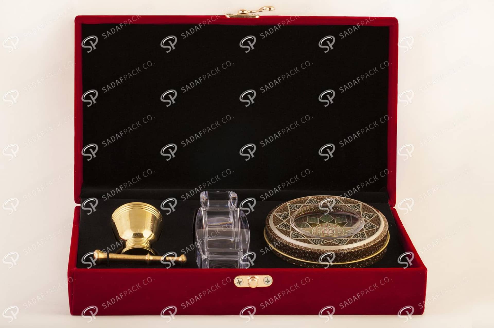 باکس زعفران مخملی قوطی 5 گرم فلزی و آذین متوسط و هاون جامی 40